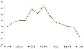 Außerdem gibt es Anzeichen für nachlassendes Wachstum in China, da Investitionen stagnieren, das Wachstum der Einzelhandelsumsätze nachlässt und die Immobilienpreise wieder schneller fallen. Der Rückgang der Investitionen in Sachanlagen (ein Minus von 2,6 % zwischen Januar und November 2025) scheint sich auf die gesamte Wirtschaft ausgewirkt und das Verbrauchervertrauen belastet zu haben. Während die Industrieproduktion trotz der Zollschocks stabil blieb (plus 4,8 % im Jahresvergleich im November), ist der Binnenkonsum in China weiterhin rückläufig (siehe Abbildung 1).