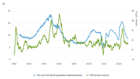 Unser Chart der Woche vergleicht den Anteil der von der Fed gehaltenen US-Staatsanleihen mit dem US-Verbraucherpreisindex (VPI) gegenüber dem Vorjahr. Deutliche Sprünge im Fed-Anteil fallen mit Phasen zusammen, in denen Inflation später wieder zu größeren Problemen führte – am deutlichsten in den 1970er Jahren und erneut nach der Pandemie. Das heißt nicht, dass die Bilanz jeden Preisschub „verursacht“. Aber sie ist ein Hebel, der verstärken kann, was Fiskalpolitik und Angebotsschocks bereits angestoßen haben.