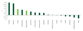 Betrachtet man jedoch das Volumen der Importe – dargestellt durch die Größe der Kreise –, wird deutlich, dass Mexiko und Kanada zwar gewachsen sind, aber immer noch nur einen vernachlässigbaren Anteil an den Gesamtimporten haben, während die Schweiz zwar größer, aber im Gesamtbild immer noch klein ist. China ist in absoluten Zahlen weitaus bedeutender, aber die Importe waren in der zweiten Jahreshälfte deutlich geringer als in der ersten.