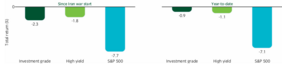 Dennoch waren US-Hochzinsanleihen auf Basis der Gesamtrendite bislang weniger stark betroffen als Investment-Grade-Anleihen und die Aktienmärkte