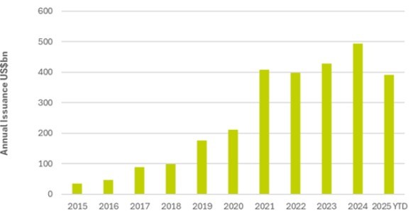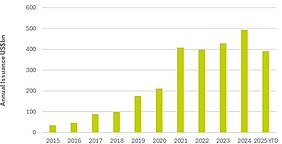 Weil der Markt auch in turbulenten Zeiten stabil war, ist er kontinuierlich gewachsen. Entsprechend hoch sind heute die Emissionsvolumina. Selbst in den schwierigen ersten Monaten des Jahres 2020 wurden ähnlich viele Anleihen begeben wie im Jahr zuvor. In der zweiten Jahreshälfte stieg das Volumen dann kräftig und erreichte neue Höchststände. Die Primärmarktnachfrage blieb hoch; offensichtlich gab es bereits eine stabile und zuverlässige Anlegerschaft. Nach dem Rekordjahr 2024 wurden bislang auch 2025 viele grüne Anleihen begeben. Das Emissionsvolumen ist ähnlich hoch wie in den Jahren zuvor.