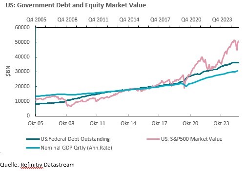 Der Vermögenseffekt wirkt … Mit den Aktienkursen steigen auch die Vermögen. Das stärkt die Konjunktur und lässt die Staatsschulden weniger problematisch erscheinen. In den USA liegt die Aktienmarktkapitalisierung in Prozent des BIP mit etwa 165% deutlich über der Schuldenstandsquote von 125% (Abbildung oben). In Europa ist der Abstand kleiner, aber auch hier treibt die gute Aktienperformance die Konjunktur. Hier dominieren Unternehmen mit realem Umsatzwachstum, was wiederum gut für Investitionstätigkeit, Konjunktur und Beschäftigung ist. Die Staatsfinanzen machen den Anlegern zwar Sorgen, doch gibt es kein besseres Mittel gegen eine zu hohe Verschuldung als Wirtschaftswachstum. Hoffen wir also, dass sich Märkte und Konjunktur weiter gegenseitig stärken, damit die Langfristzinsen nicht aus dem Ruder laufen. Eine Aktienmarktkorrektur mit niedrigeren Wachstumserwartungen und Steuereinnahmen wäre für den Staatshaushalt und langfristige Anleihen gleichermaßen schlecht.