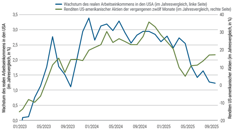 - Politische und technologische Veränderungen trugen ebenso zu einer Spaltung der US-amerikanischen Haushalte bei. Der Vermögenseffekt der KI-bedingten Aktienmarktgewinne hat dazu beigetragen, den Konsum zu stützen. Diese Vorteile sind jedoch bei Haushalten mit niedrigem und mittlerem Einkommen nicht angekommen (siehe Abbildung 1). Da die größere Unsicherheit Neueinstellungen gehemmt hat und in handels- und KI-abhängigen Sektoren Arbeitsplätze abgebaut wurden, ist das Wachstum der realen Arbeitseinkommen ins Stocken geraten. Der Ausbau von KI-Systemen scheint auch andere Investitionen, unter anderem in den Wohnungsbau, zu verdrängen – und damit bezahlbaren Wohnraum noch rarer zu machen.