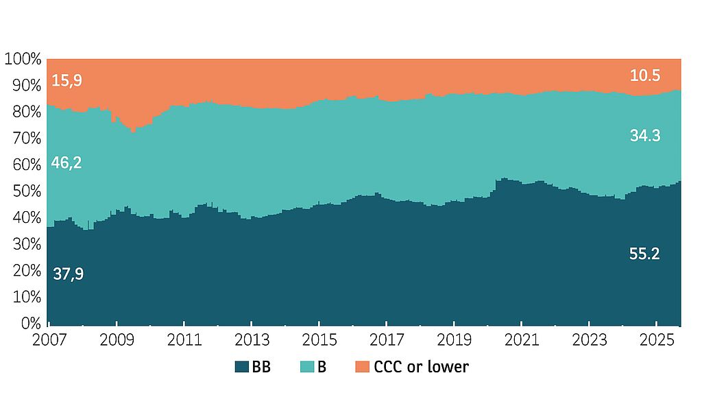 Vor diesem günstigen Hintergrund haben sich die Spreads weiter verengt, was die Frage aufwirft, wie viel Aufwärtspotenzial bis 2026 noch besteht. Es ist wichtig zu beachten, dass die Spreads zwar im historischen Kontext niedrig erscheinen, aber bereinigt um die aktuelle Zusammensetzung des US-Hochzinsmarktes deutlich weniger. Das aktuelle Spread-Niveau wird gestützt durch einen nahezu rekordhohen Anteil an BB-Anleihen, einen nahezu rekordniedrigen Anteil an CCC-Anleihen, einen Rekordanteil an besicherten Anleihen (35 %) sowie rekordniedrige Duration und niedrige Geld-Brief-Spannen (d. h. bessere Liquidität).